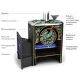 • Печь имеет две каменки. Закрытая со всех сторон прогревается излучением и конвекцией от газопламенного потока. Вода в закрытую каменку подается через компактную воронку с клапаном, где и испаряется.